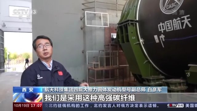 航天科技集团四院大推力固体发动机型号副总师 白彦军:整个发动机来说,壳体我们采用高强碳纤维复合材料产品成型的,采用碳纤维有两个好处,一是整体的质量很轻,第二个是不管是从成本还是性能上来讲,都会有很大的提升。
